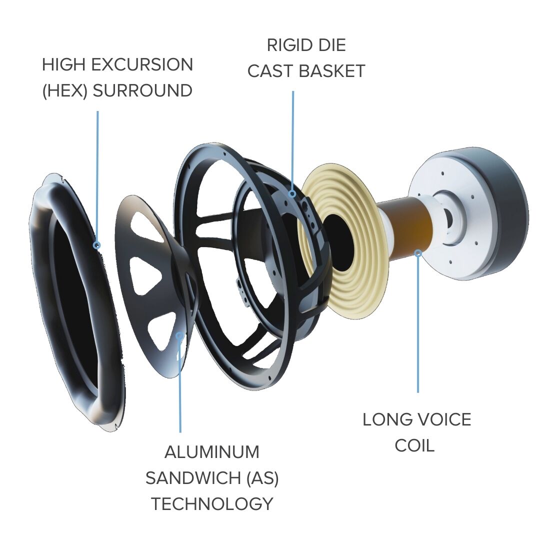 - 2x 250 mm Tieftöner HEX PP