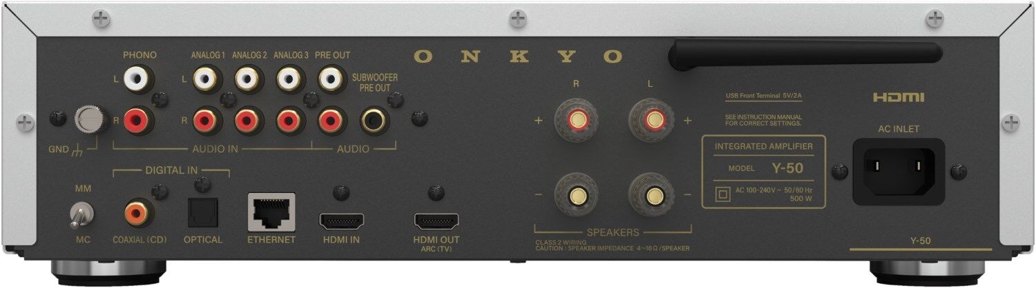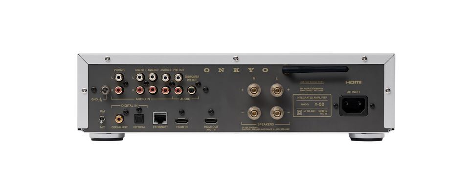 Der Y-50 bietet nahezu alle Ein- und Ausgänge, die für ein vollständiges Audio-Setup erforderlich sind. Dazu gehören drei Paar analoge Cinch-Eingänge, ein koaxialer Digitaleingang, ein Phono-Eingang (MM/MC-kompatibel) sowie ein HDMI-Eingang, HDMI ARC und ein HDMI-Ausgang. Dank Ethernet- und WLAN-Unterstützung ermöglicht der Y-50 modernes Streaming.